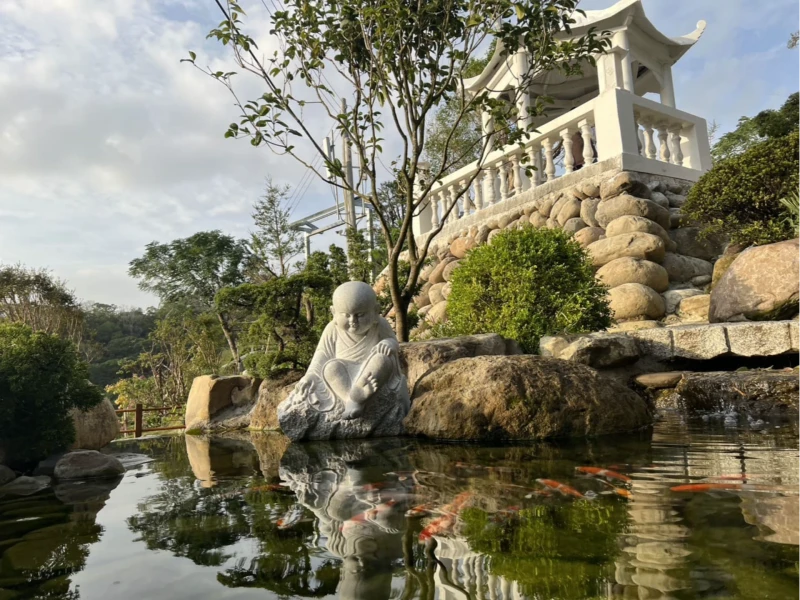 彌陀山一心淨苑戶外環境中的小水池與鯉魚池。水池位於望西庭下方的梯級平臺區,設有休憩石桌石椅,提供信眾在動態的步道經行後,能在此靜觀清涼水景、歇息心靈,並仰望西向的望西亭,完成動靜結合的修行體驗。Read More -