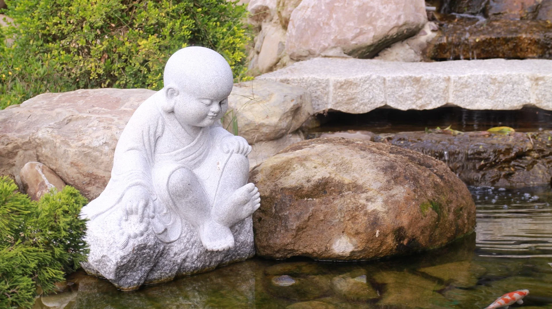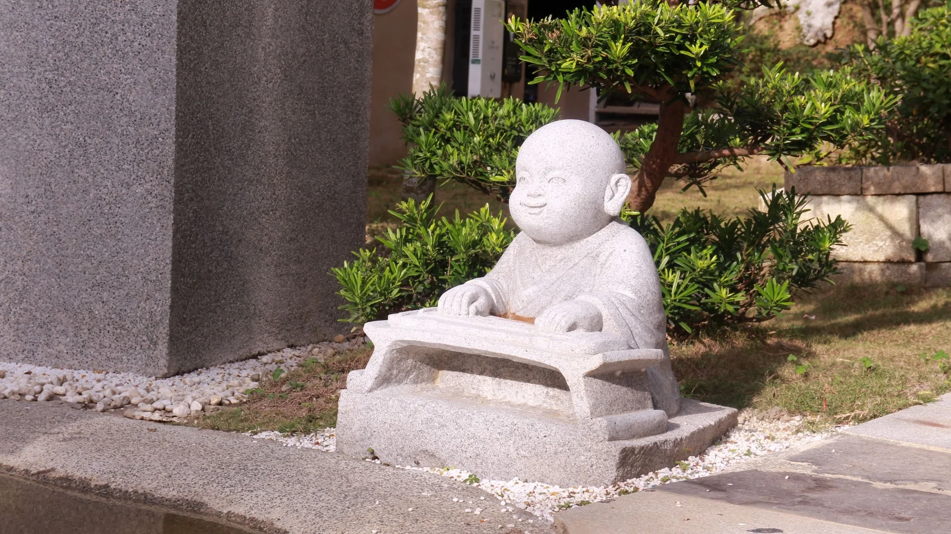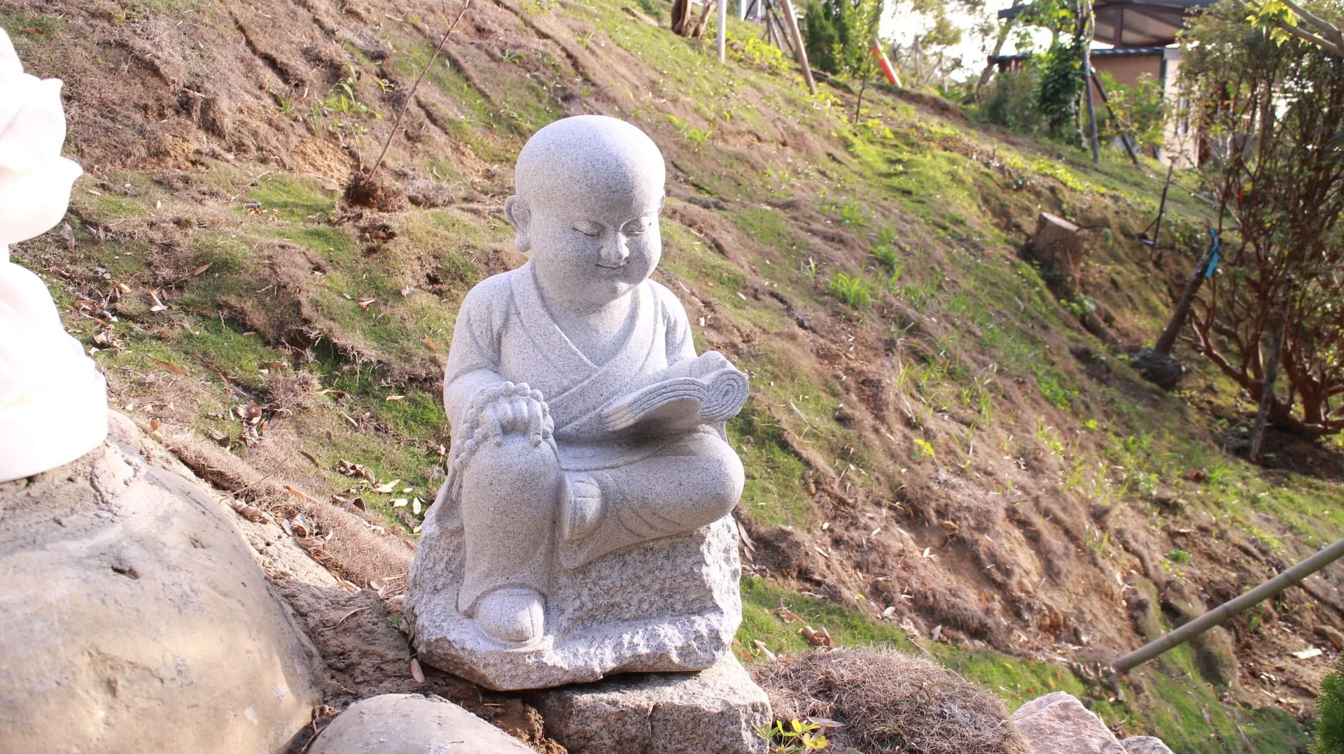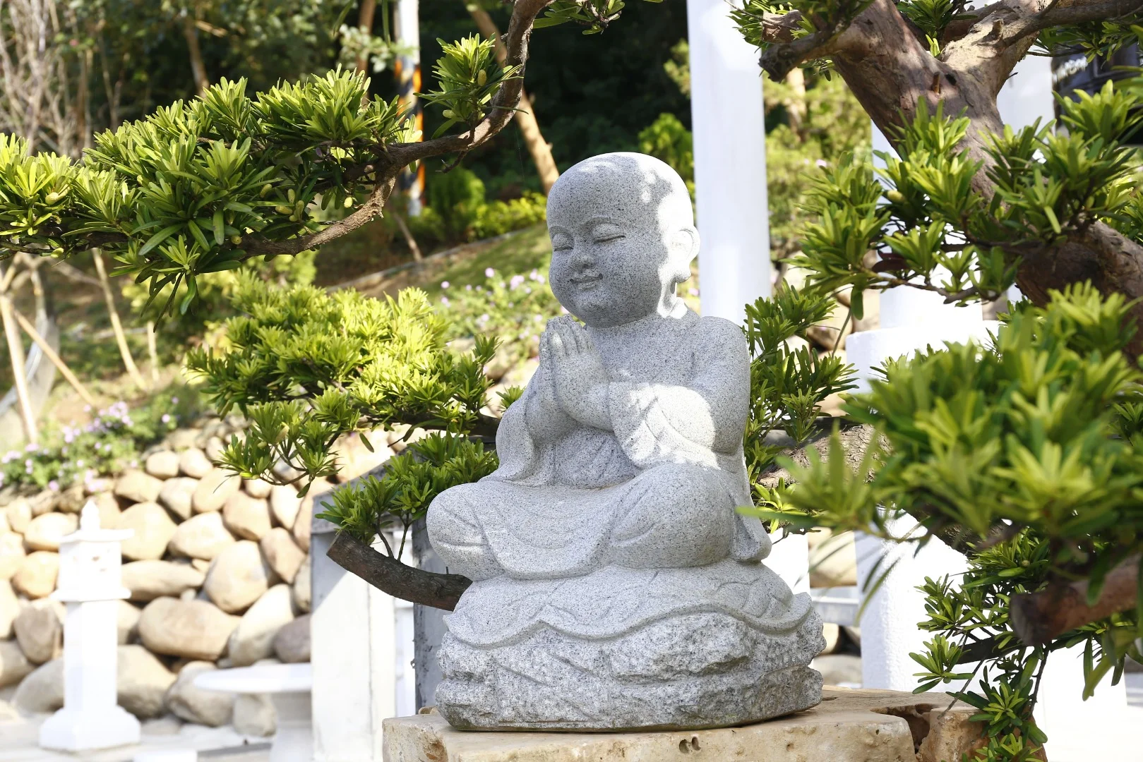彌陀山一心淨苑周圍的戶外淨悠環境中,沿著步道與水景安立著一尊尊造型活潑、神態安詳的小沙彌佛像。這些佛像不僅是道場整體景觀設計中不可或缺的一部分,也承載著接引大眾、啟發初發心菩提的責任。